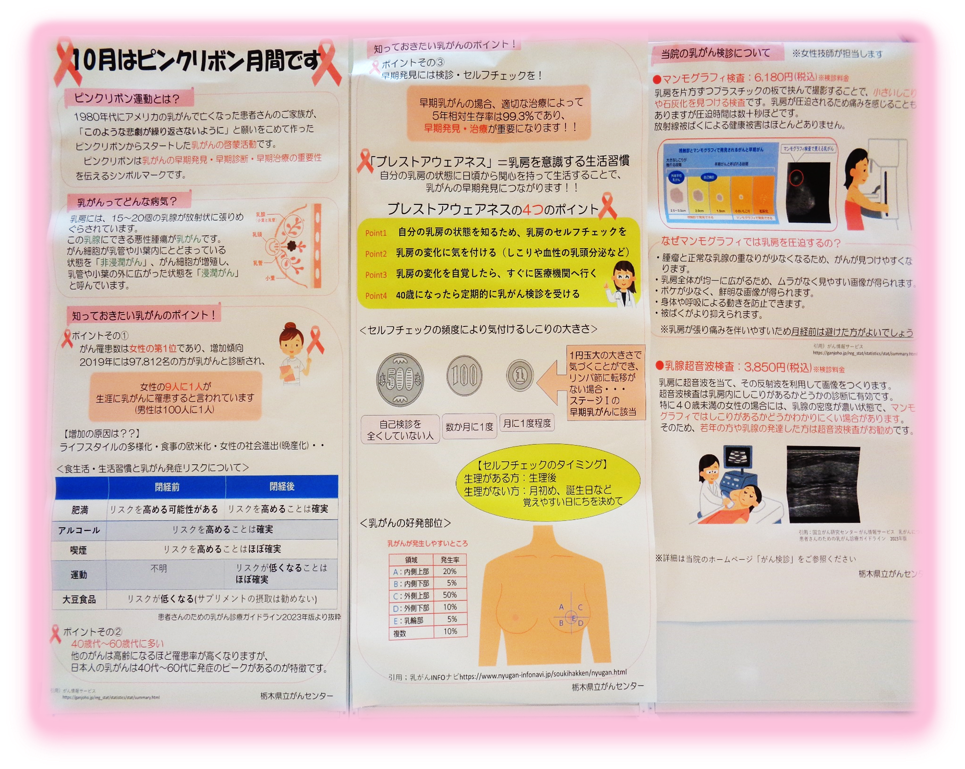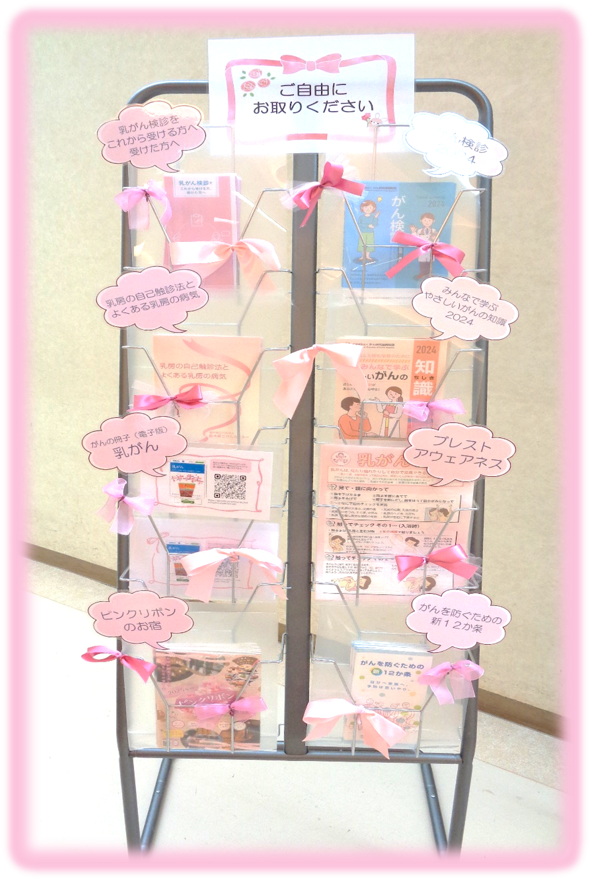 センター内売店前通路にて情報提供コーナーを設置し、がんの事や検診、乳がんに関するチラシや冊子を配布しています。