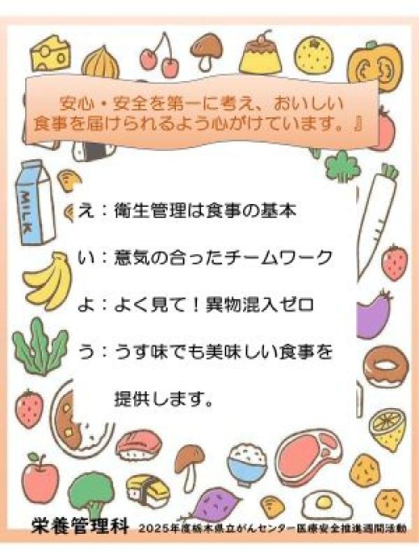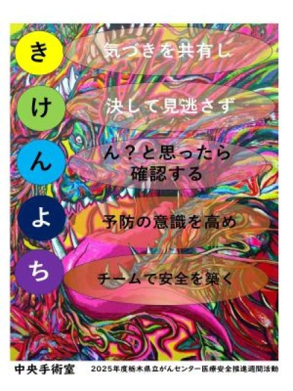 栃木県立がんセンターでは、院内の医療安全意識を高める取り組みとして、各部署で「医療安全あいうえお作文ポスター」を作成しました。
